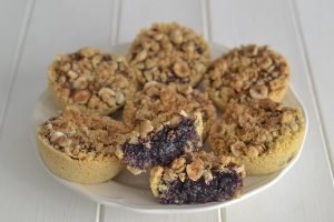Crostatine morbide con ripieno cremoso ai mirtilli e superficie croccante alle nocciole. Dosi per 9-10 crostatine.