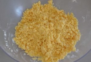 - Sciogliete il burro in un pentolino a fiamma bassa. Fatelo intiepidire e aggiungetelo a poco a poco agli altri ingredienti, impastando con le mani e formando un impasto sbriciolato.