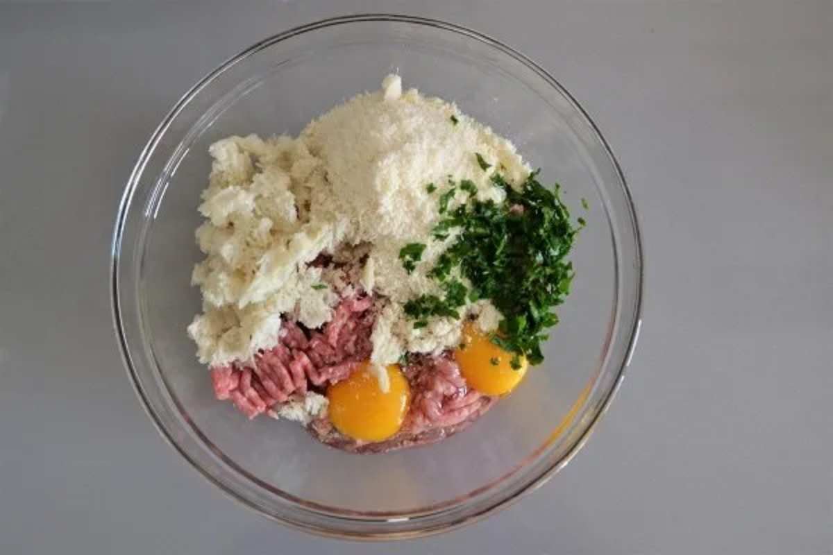 - 2. In una ciotola capiente aggiungi la carnemacinata, le uova, i capperi e la mollica di pane sbriciolata.